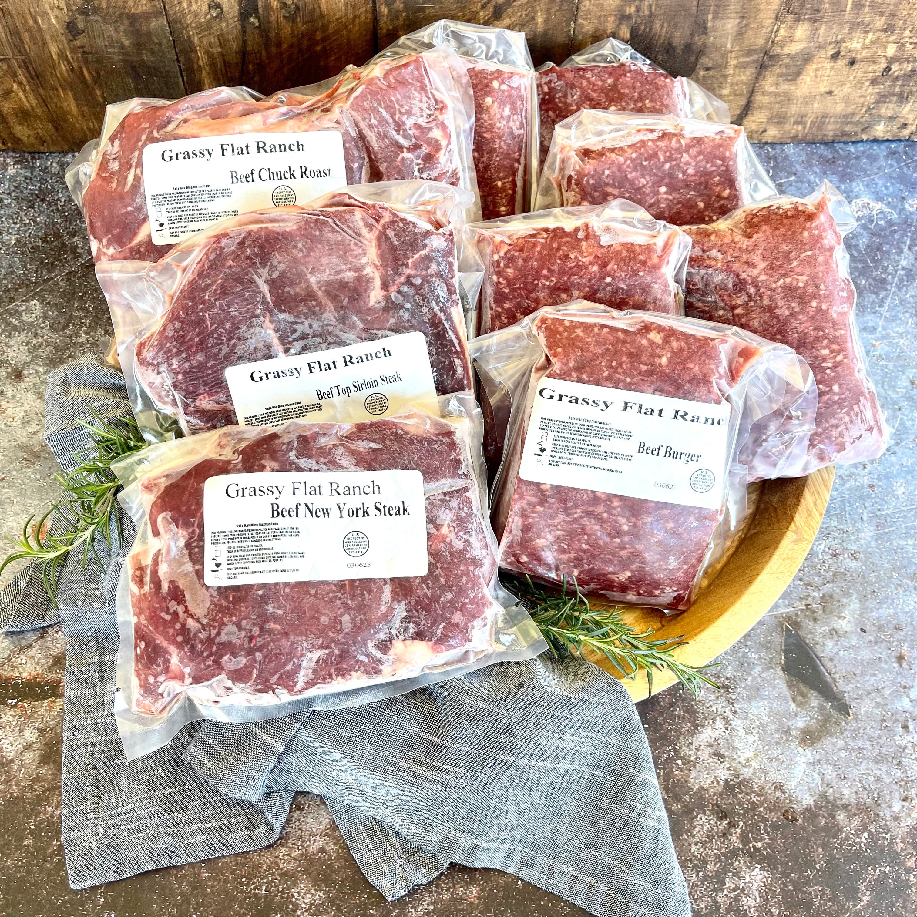 The Grassy Flat Sampler is a great way to sample a variety of our grass-finished beef cuts. It includes six 1-pound packages of ground beef, two different cuts of steak, each with two steaks in each package, and one roast. If you don’t have a lot of freezer space or you just want to give our meat a try, this is the option for you. All meat is packaged by our local USDA butcher, vacuum sealed and frozen solid.