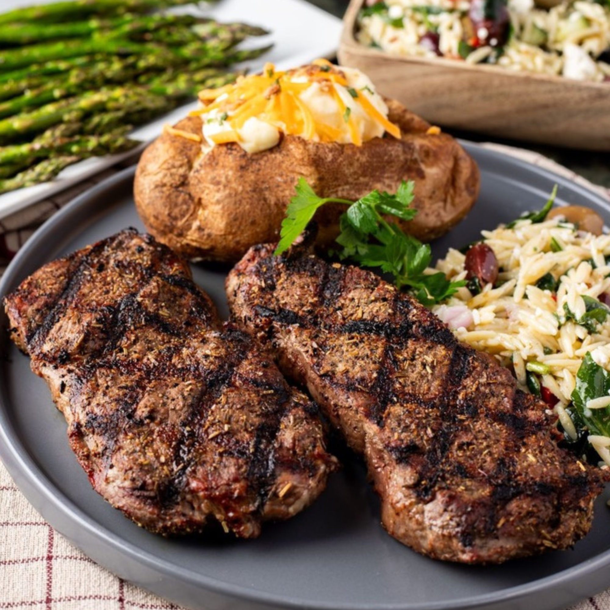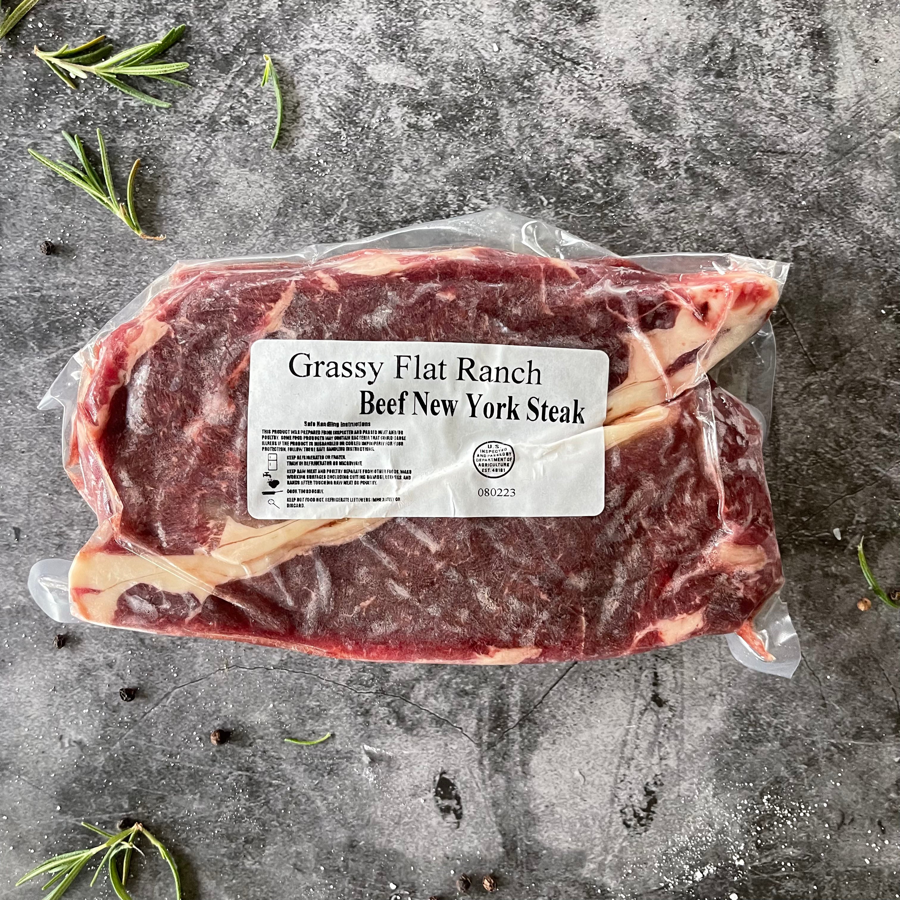 Our grass-finished and dry aged New York steaks are cut 1" thick and oh so tasty! New York steaks are packaged two per package and all steaks are packaged by our local USDA butcher, vacuum sealed and frozen solid.*