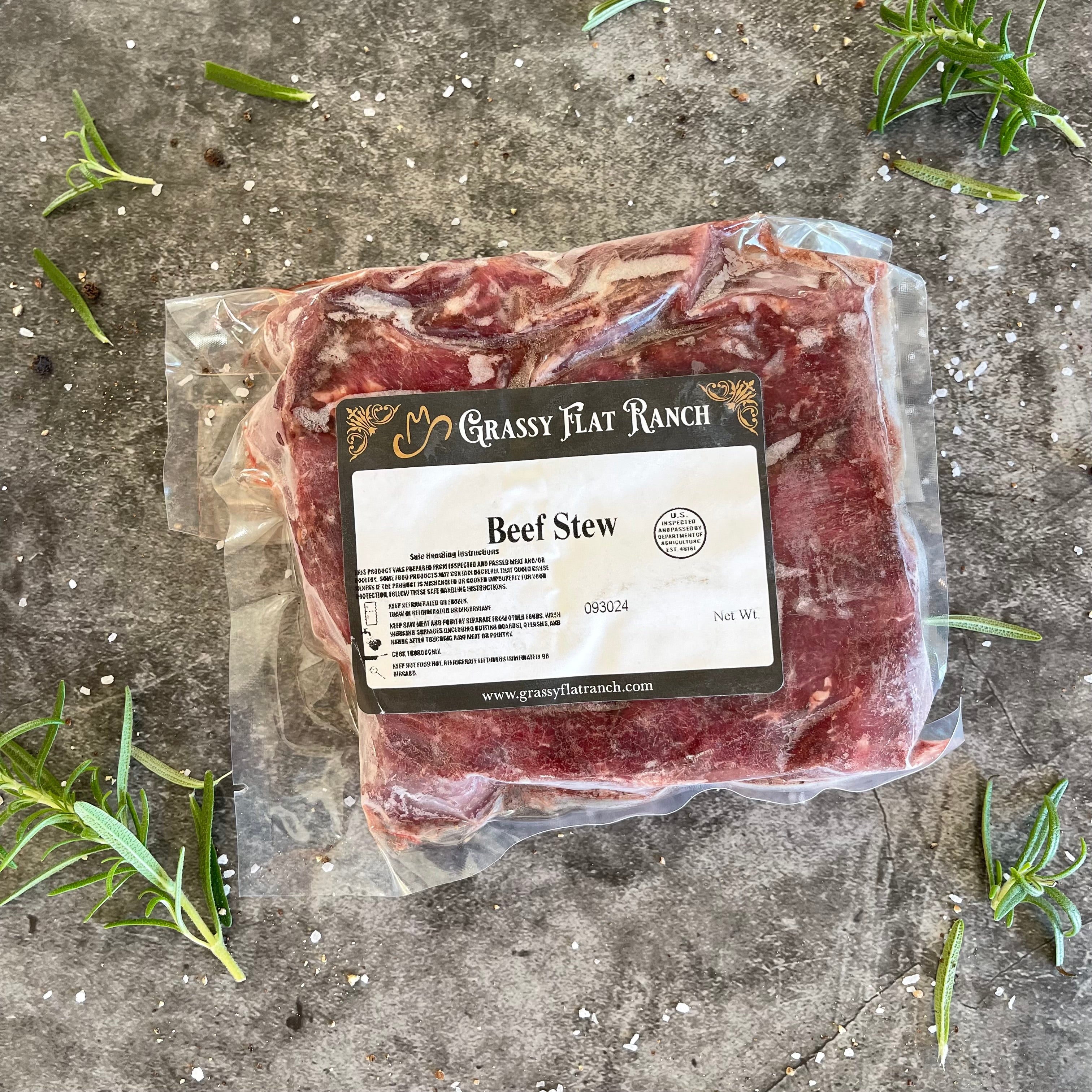 Typical stew meat can be a bunch of trim scraps leftover from the butcher, not Grassy Flat Ranch stew meat. Each cube of meat is cut from the rump roast of the animal, that means each bite of meat will be a hardy piece of meat that is tender and delicious! Elevate any stew, kabob, or stir fry with our stew meat. All stew packages weigh between 1-2lbs. Stew meat is packaged by our local USDA butcher, vacuum sealed and frozen solid.*