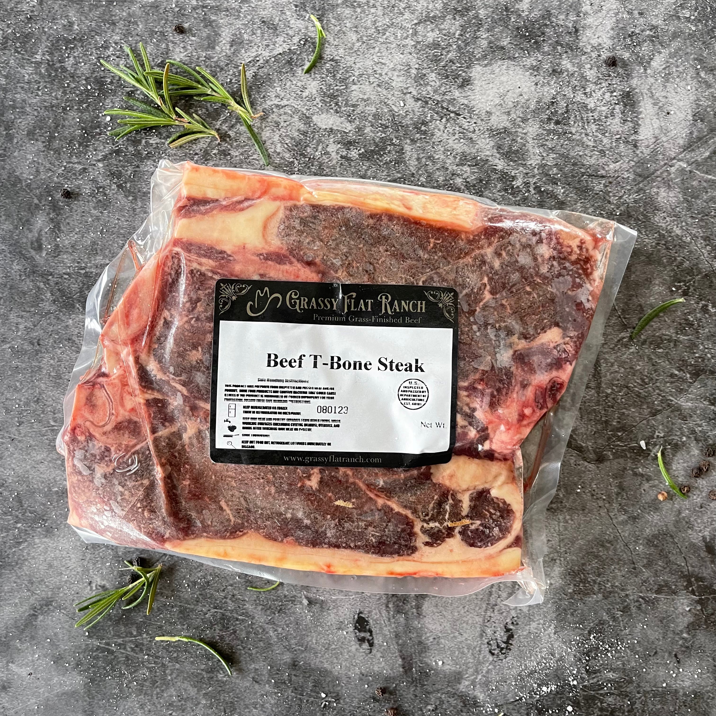 Enjoy your steakhouse favorite right from home with Grassy Flat Ranch's delicious t-bone steaks. Tender and delicious these 1" thick t-bones will make your mouth water. Steaks come two per package and all meat is packaged by our local USDA butcher, vacuum sealed and frozen solid.*